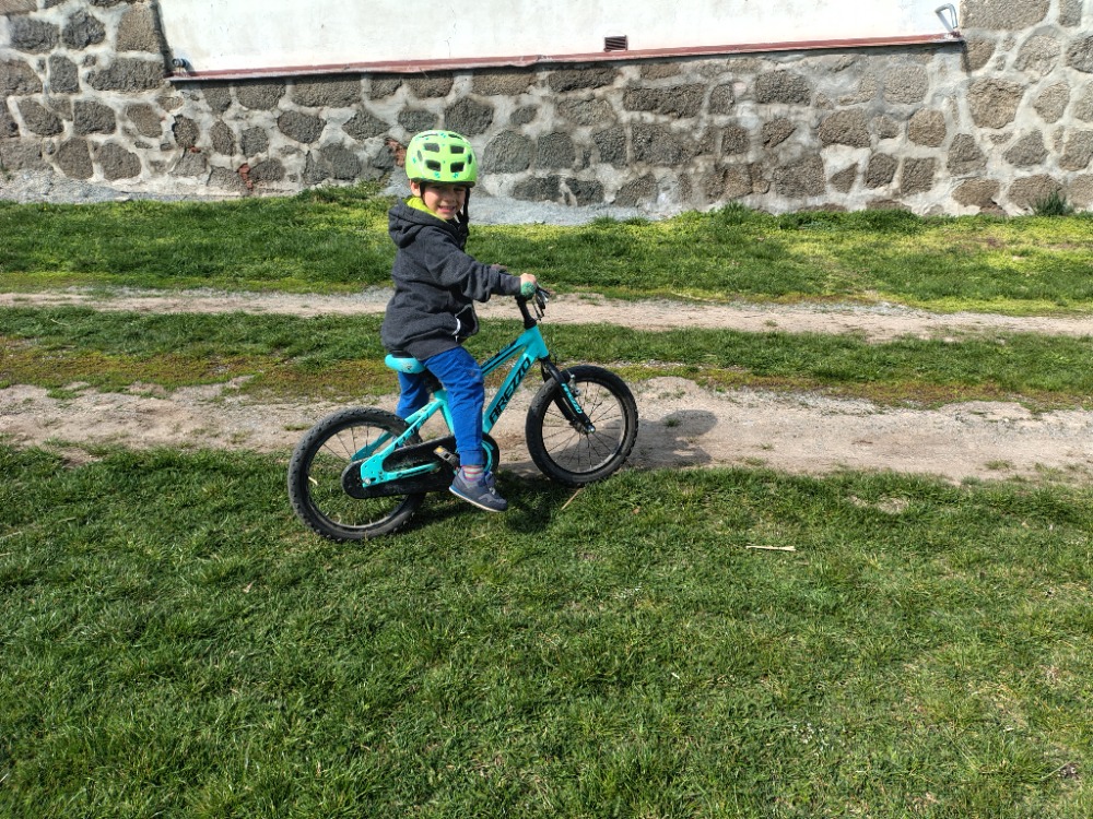 Na náš první cyklovýlet jsme vyrazili jednu březnovou sobotu, kdy bylo docela hezky.  Udělali jsme okruh asi 15 km se zastávkou v Budišově a občerstvením v místním obchůdku. Po cestě jsme objevili malý zatopený lom u Valdíkova, moc pěkné místo, kam se určitě v létě zajedeme vykoupat. Angelo se také v březnu naučil jezdit na kole, abychom už v dubnu mohli vyrazit na menší cyklovýlet okolo rybníku Pyšelák a na „Tarantuli“ (mystický skalní útvar, připomínající Menhiry).